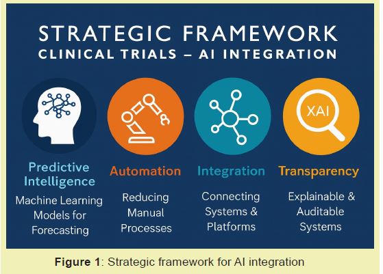 Framework development: Based on the synthesized evidence, we developed a strategic four- pillar framework for AI integration in clinical trials: Predictive Intelligence, Automation, Integration, and Transparency. This framework was constructed through iterative analysis of successful implementation patterns, regulatory requirements, and identified gaps in existing industry models. This framework introduces ethical governance and data interoperability as foundational elements and ensures that the review findings accurately represent the current state of AI applications in clinical research while providing actionable guidance for researchers, regulators, and industry stakeholders seeking to modernize clinical development processes.