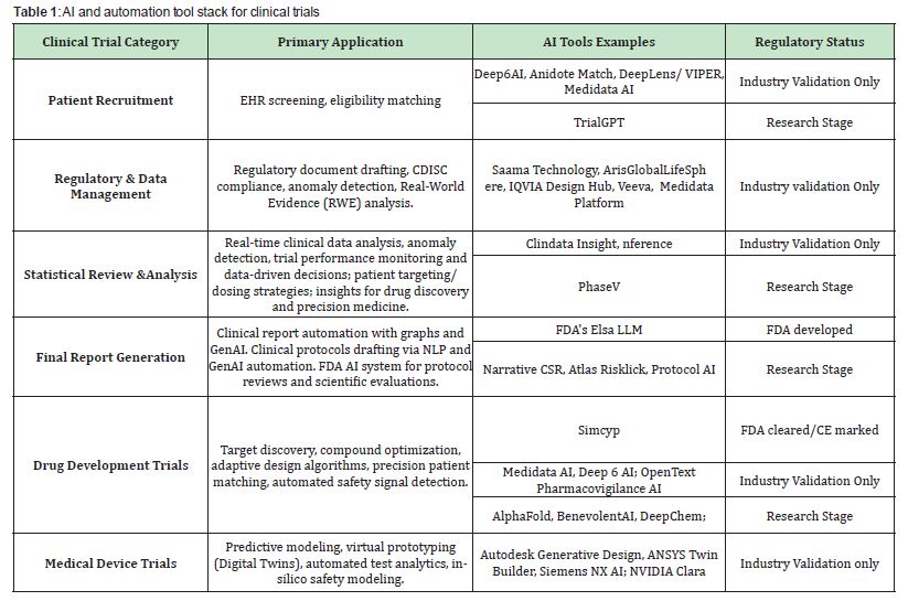 Table 1 offers examples of existing AI and Automation tool stack for clinical studies within the discussed framework.