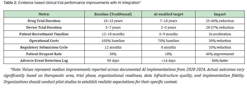 Evidence demonstrates AI can reduce trial duration by 25-40%, lower operational costs by 30%, and double recruitment speed while improving safety monitoring and patient retention. A case study from Cleveland Clinic demonstrated AI-powered patient identification in approximately 2.5 minutes with 96% accuracy, compared to 427-540 minutes for manual screening with 88- 95% accuracy. When deployed within robust governance structures and internationally coordinated regulatory frameworks, AI integration represents a paradigm shift enabling faster, safer, and more efficient clinical development. Implementation challenges include data standardization barriers, algorithm validation concerns, and the critical need for harmonized global infrastructure to realize AI's transformative potential.