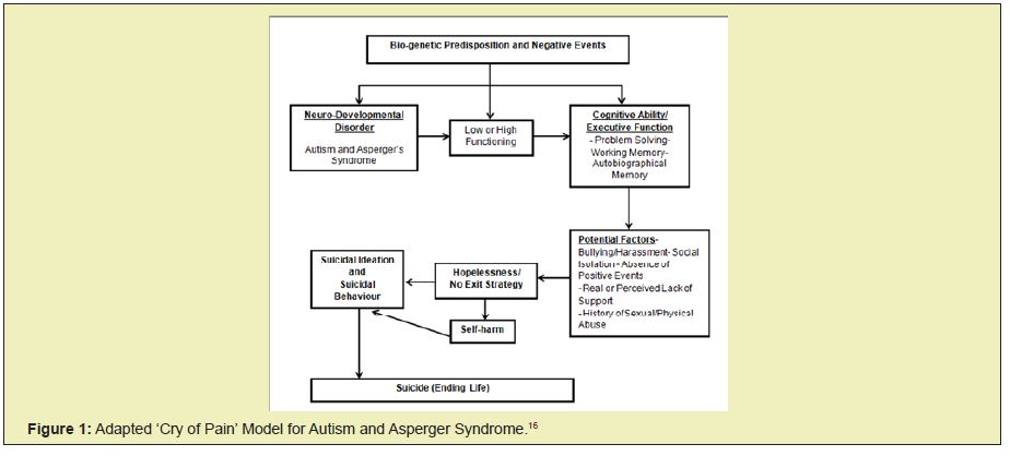 The adapted ‘Cry of Pain’ model below takes into account biopsychosocial factors.16 Bio-genetic predisposition paired with negative events appears to increase suicidal ideation/behaviour. Individuals with low spectrum autism are less likely to perform suicidal acts, whereas individuals with Asperger’s are perceived to be high-functioning. As discussed, to plan and execute a specific action, one requires a set of stages, such as higher planning and problem solving ability.