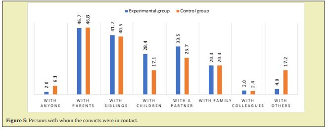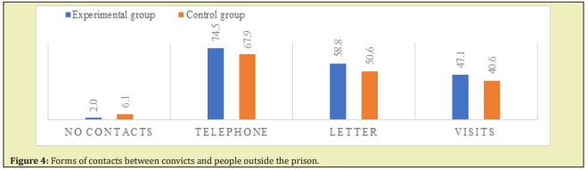The most common form of contact between convicts and the "outside world" was telephone contact, with 75% of the experimental group and 68% of the control group using this possibility. Another popular form of correspondence were letters – with 59% and 51% of people, respectively. In the experimental group, nearly half (47%) of the contacts with persons from outside the prison were in the form of visits. In the control group it was slightly less –about 41%. An interesting result is indicated by the percentage of people who were not in contact with anyone from outside the prison. In the experimental group, such individuals accounted for less than 2%, while in the control group it was 6%. This result was compared with the return-to-crime rates in the groups studied, as it was assumed that having support networks, family and non-family contacts would promote the proper social functioning and, above all, would be a positive indicator for receiving social support after leaving the prison. However, no statistically significant differences were observed (Figure 4).