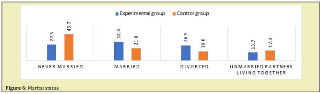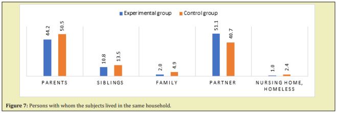 In the two groups compared, the most subjects lived with their parents (see Figure 5) and partners; this is also consistent with the distribution of responses regarding the marital status and the victims of abuse (Figure 7).