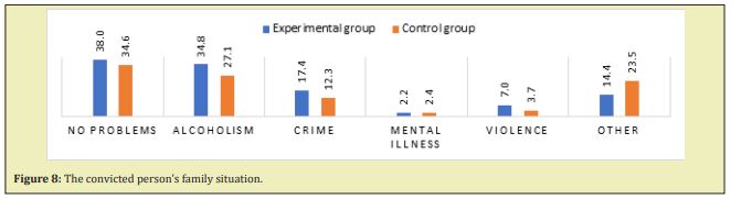 In the populations compared, the experimental group differed slightly in terms of the absence of problems in the primary family. One third of the subjects reported no problems with the family. One in three of the experimental-group subjects and one in four of the control-group patients grew up in a family with an alcohol problem (one parent's addiction). One in six, on the other hand, grew up in a family with a criminal history. In a small percentage of cases (about 2%), the families were affected by mental illness (see Figure 6). The convicts from the experimental group were slightly more likely (7%) to grow up in families where violence occurred than those in the control group (4%) (Figure 8).
