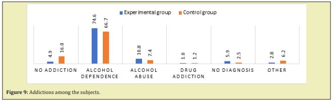 It is worth noting that both in the experimental and control groups the majority of subjects had an addiction problem. In the experimental group, only 5% of subjects were not found to be addicted to any substance and in 6% of cases the subject had not been examined in this regard. Three quarters were diagnosed with alcohol dependence, while one in ten was diagnosed with alcohol abuse; 1% of those convicted in the experimental group were drug addicts, and 3% were cross-addicted. In the control group, no addiction was found in 16% of the convicts participating in the study, and about 6% of them did not have an adequate diagnosis. The vast majority were found to have one form of addiction. In about 67% of cases it was an addiction to alcohol, slightly over 1% – to drugs, and slightly over 6% suffered from a cross-addiction (alcohol and drugs, and in one case – alcohol and medication) (Figure 9).