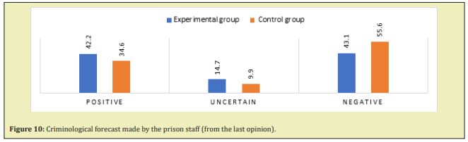 According to the most recent criminological forecasts available in the prison files prepared by the prison staff, about 42% of the convicts in the experimental group had a positive forecast, while in the control group it was the case for one in three convicts. In 15% and 10% of the experimental and control groups, respectively, the forecast was uncertain, as both negative and positive indicators were found. Interestingly, a negative forecast was made with regard to 43% of those convicted in the experimental group and more than half (56%) of the control group. It should be stressed that the actual return-to-prison rate was 16% and 28% for the groups analysed. The compliance of the forecast with the actual return rates was within 40% (Figure 10).