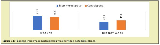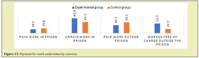 As highlighted in the literature, one of the effective rehabilitation impacts can be work.12 Not only does it ensure a constructive use of time during the time in prison, but it allows for the convicts to accumulate the necessary funds for ongoing expenses or to be used after leaving the facility. For organisational reasons, not all convicts in Poland have the opportunity to take up work while in prison. It should also be stressed that not all detainees are interested in this possibility. In both groups studied, the majority of convicts worked during their time in prison (63% and 57% for the experimental and control groups, respectively) (detailed distribution of responses is shown in Figure 12).