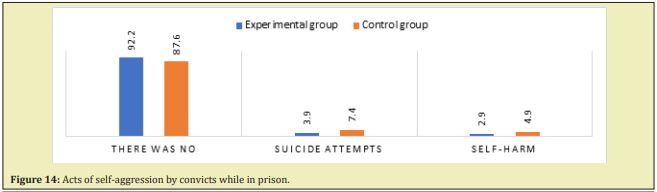 In total, self-committed aggressive acts (suicide attempts and self-harm) occurred in the case of approximately 7% of the convicts participating in the study and 12% of the control group (Figure 14).