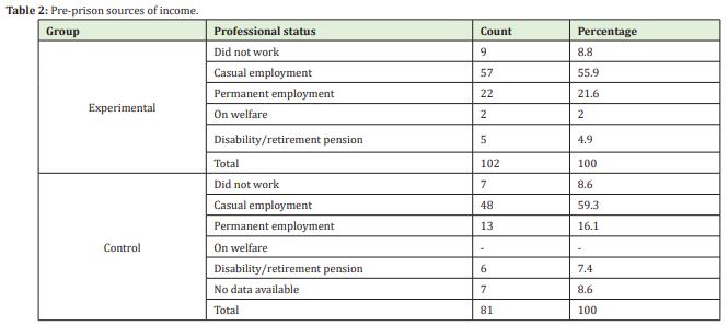 The distribution of the level of education of the convicts participating in the study indicates that the experimental group was better prepared in terms of professional qualifications, as about 65% of those surveyed had post-primary education (basic vocational education – 53%, average – 14%). In the control group, the proportion of people with primary education was higher and amounted to 44%. Nearly half had basic vocational education, while the total of around 5% had secondary or tertiary education (see Table 1).