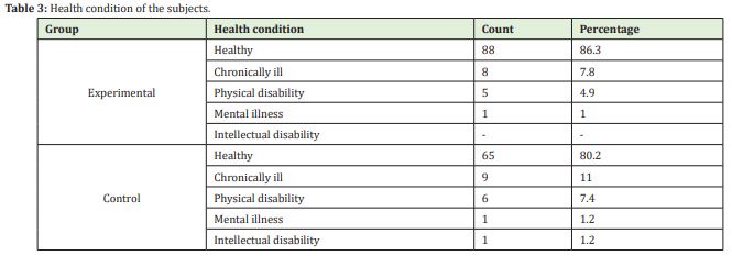 The health condition of the subjects was also analysed. In the majority of cases, there was no information about any problems in this regard. In the two groups compared, the situation was similar, with 86% and 80% of the experimental group and control group, respectively, being healthy. About 8% of those surveyed in the experimental group were chronically ill, 5% were physically disabled and in one case the subject was diagnosed with a mental illness. In the control group, one in nine were chronically ill, just over 7% of people were physically disabled; an intellectual disability was found in one case, and a mental illness in another one (see Table 3).