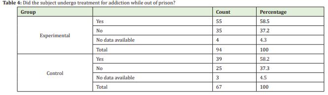 In both the experimental group and control group, the proportions of addicts who attempted to undergo treatment were similar (58%). However, one in three of those who had a problem with addiction did not seek treatment (see Table 4).