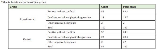 Analysis of data on the functioning of convicts in prison indicates that people from the experimental group functioned much better in prison facilities, with only 16% reporting conflicts with co-inmates or with the staff. In the control group, the percentage was 31%, i.e. almost a third (Table 6).