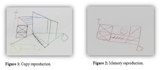 In Rey Complex Figure, the copy reproduction (the image on the left side) revealed difficulties related to visual motor control and graphic apprehension. The lack of the central armour might be interpreted as an inability to contain anxiety.