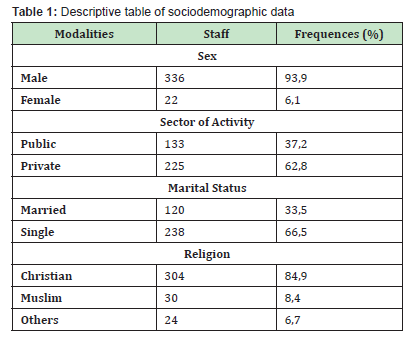 It emerges from the analysis of the results related to identification that, among the 358 workers surveyed, 93.9% were male. Concerning the sector of activity, we note that 37.2% of the respondents worked in the public sector, while 62.8% in the private sector. Also, the results show that 33.5% were married against 66.5% single. Among the participants, 84.9% were Christians, 8.4% were Muslims and 6.7% were other unidentified religions. The age of the participants was between 18 and 60 years (37.5 ± 1.31 years) Table 1.