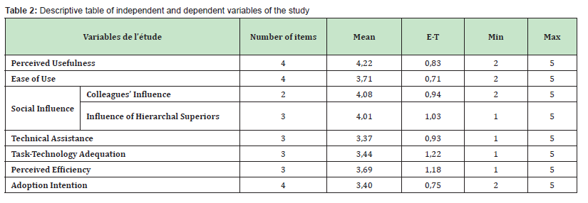 The results of the descriptive analyses for the variables perceived usefulness, ease of use, social influence, technical assistance, task-technology fit, perceived effectiveness and adoption intention are presented in Table 2. The overall mean for the four items of the perceived usefulness variable is 4.22±0.83 (min = 2; max = 5), which is above the theoretical mean of the scale which is 2.5; In fact, the respondents find the WhatsApp social network useful in the context of work. The observation of this same table shows that the respondents of this study in their great majority find the WhatsApp social network easy to use and the overall mean for the four items of the ease-of-use variable is 3.71±0.71 (min = 2; max = 5). The overall means for the sub-variables of social influence are respectively 4.08±0.94 (min = 1; max = 5) for the influence of colleagues and 4.01±1.03 (min = 1; max = 5) for the influence of the hierarchical superior, in other words the workers interviewed use the social network in the context of work, because they are influenced on the one hand by colleagues and on the other hand by hierarchical superiors. The overall mean for technical assistance is 3.37±0.93 (min = 1; max = 5). This value is above the theoretical mean indicating that the respondents in the context of work find technical assistance when using WhatsApp. The overall mean of the task-technology fit is 3.37±0.93 (min = 1; max = 5), this is above the theoretical mean of the scale which is 2.5. Here, the workers interviewed find WhatsApp compatible with the tasks to be performed. The overall average for the perceived efficiency variable is 3.69±1.18 (min = 1; max = 5), the respondents find that WhatsApp is effective for carrying out the work. Finally, the overall average for the four items of the adoption intention variable is 3.40±0.75 (min = 2; max = 5) and is above the theoretical average which is 2.5. Thus, the intention of the respondents towards the use of the WhatsApp social network in the context of work is positive.