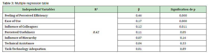 Table 3 shows that 42% of the variance in the intention to adopt the WhatsApp social network by Cameroonian workers in a professional situation is explained by the feeling of perceived effectiveness, the ease of use and the influence of colleagues with R2 = 0.42, which is significantly different from 0, F (3, 354) = 86.26, p = 0.000. Thus, we find that the feeling of perceived effectiveness significantly and positively predicts the intention to adopt the WhatsApp social network by workers in a professional situation (ß = 0.46, p = 0.000), followed by the ease of use which is also a significant and positive predictor of the intention to adopt the WhatsApp social network by Cameroonian workers in a professional situation (ß = 0.17, p = 0.000). Finally, the influence of colleagues (ß = 0.12, p =0.01) and perceived usefulness (ß = 0.11, p =0.05) also significantly and positively predict the intention to adopt the WhatsApp social network by Cameroonian workers in a professional situation with respectively. The other variables in this study are not significant predictors of the intention to adopt the WhatsApp social network by Cameroonian workers in a professional situation. In particular, the influence of the superior (ß = 0.07, p =0.16); technical assistance (ß = 0.04, p =0.33) and task-technology fit (ß = 0.01, p =0.89).