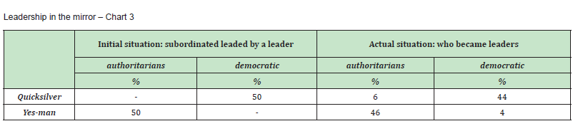 The leadership in the mirror in a new concept based on personal observations that starts from a study done during 10 years upon 50 persons initially subordinates, in leading positions nowadays. We have grouped the 50 persons in 2 subordinates’ categories: