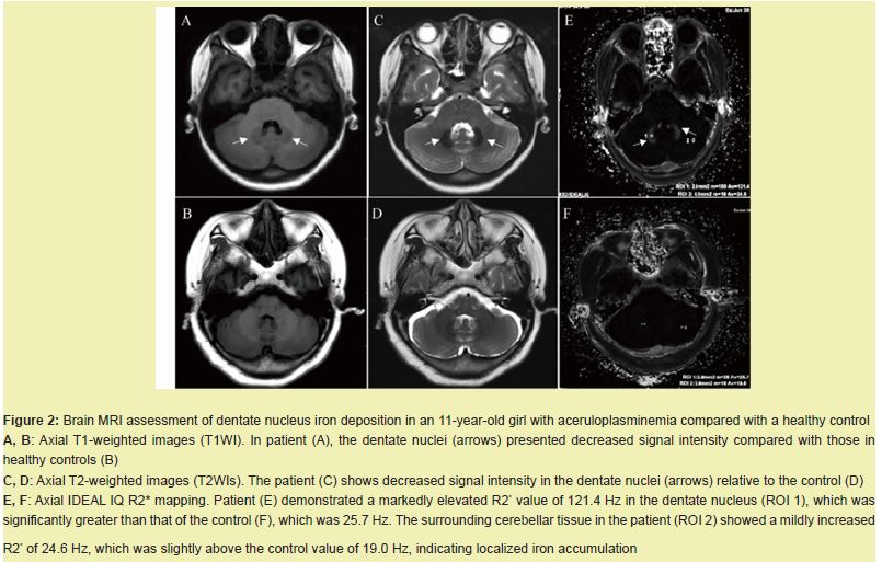 Iron chelation therapy is currently the cornerstone treatment for aceruloplasminemia. The small lipophilic chelator deferiprone crosses the blood–brain barrier to capture deposited Fe²⁺ and promote its urinary or biliary excretion.19 whereas the hydrophilic chelator deferoxamine or oral deferasirox primarily clears hepatic and splenic iron.20,21 In this case, the child received oral iron chelation therapy. The short-term response has been favorable: anemia has improved, and serum ferritin has decreased. However, the duration of treatment remains brief, and the long-term efficacy is still uncertain; therefore, repeated reassessment of this patient is needed.