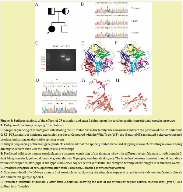 A homozygous splicing mutation in the CP gene (NM_000096.3: c.147-2A > G) was identified via whole-exome sequencing. Pedigree analysis revealed that the parents of the affected child were carriers of the mutation Figure 3A, 3B. Variation frequencies in multiple public databases of mutations are extremely rare or absent in the general population (1000 Genomes Project, ESP6500, gnomAD_exome, ExAC). Bioinformatics analysis (PolyPhen-2, MutationTaster, SIFT, and CADD) predicted both mutations as pathogenic Table SIII. RT‒PCR analysis of minigene expression demonstrated that the splicing mutation led to a truncated transcript in the mutant compared with the wild type Figure 3C. Sanger sequencing confirmed that the mutation resulted in exon 2 skipping, causing exon 1 to be spliced directly to exon 3 Figure 3D. Structural modeling of wild-type human ceruloplasmin revealed that its six-domain architecture is stabilized by a trinuclear copper cluster located at the interface between domains 1 and 6 Figure 3E. Deletion of exon 2 resulted in a predicted structural disruption of domain 1, abolishing the trinuclear copper cluster and the associated calcium- and sodium-binding sites Figure 3E-H. This structural alteration likely impairs the ferroxidase activity of ceruloplasmin, contributing to systemic iron overload.