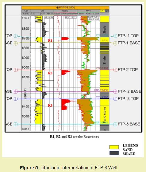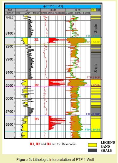 FTP WELL 3 covers a depth interval of 4579-9561 m subsea Figure 5. The rock unit penetrated by the well is alternating sand and shale layers, typical of the Agbada formation. The thickness of sand unit decreases with depth, with a corresponding increase in shale units.The sand units serve as reservoir rocks while shales serve as seal/cap rocks to the reservoirs. Three reservoirs exist at depth of 8167 m, 8478 m and 8758 m denoted as R1, R2 and R3.