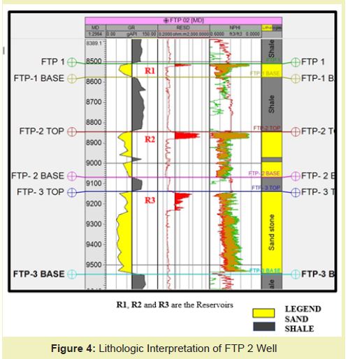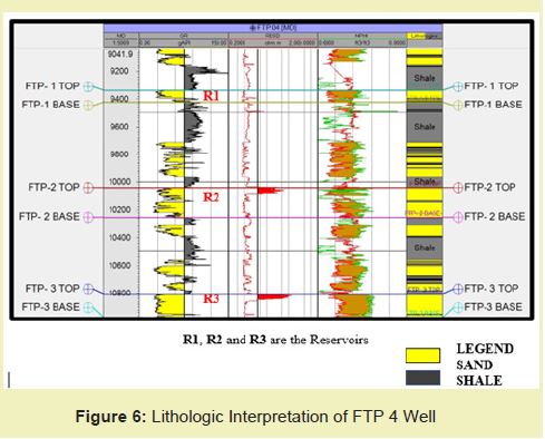 FTP WELL 4 covers a depth interval of 762-11005 m subsea Figure 6. The rock unit penetrated by the well is alternating sand and shale layers, typical of the Agbada formation. The thickness of sand unit decreases with depth, with a corresponding increase in shale units. The sand units serve as reservoir rocks while shales serve as seal/cap rocks to the reservoirs. Three reservoirs exist at depth of 8129 m, 8448 m and 8730 m denoted as R1, R2 and R3.