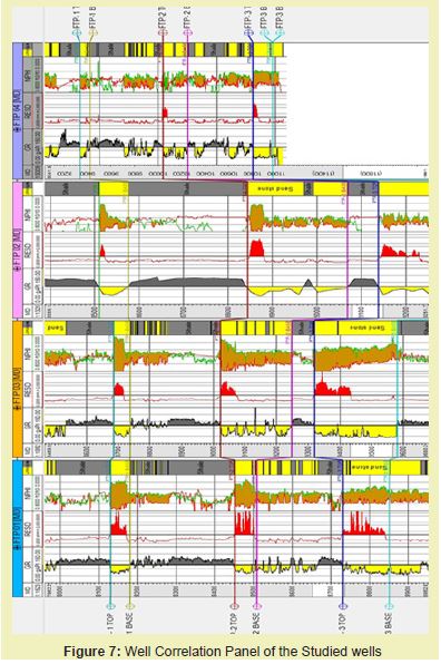 Figure 7 shows the well log correlation panel of the field it is composed of FTP wells 1,2,3 and 4. The correlation panel trends from north to south direction and it is composed of four wells. The general stratigraphy is alternation of sand and shales typical of the Agbada formation. The shale units are very thick and extend across all the wells the sand units are thin and constitute the reservoir units. In the same vein,16 conducted research on Reservoir characterization of GABO field in the Niger delta basin using facies and petrophysical analyses and discovered that the shall units are very thick which extend across all the wells.