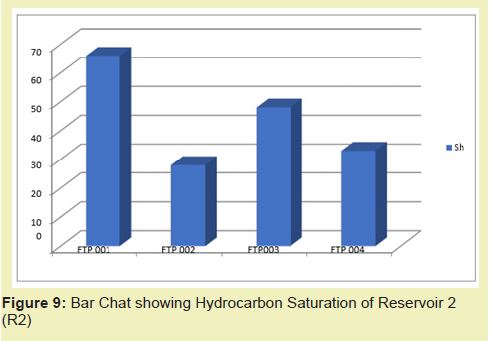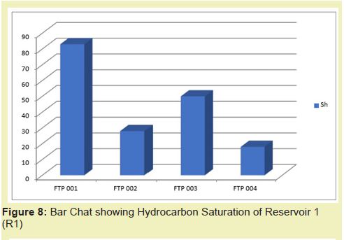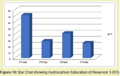 The bar chat represents petrophysical parameter in the form of distinct bars it represents the hydrocarbon saturation of each reservoir across the wells. It also shows the average effective porosity and permeability of the reservoir across the wells. Reservoir 3 has the highest hydrocarbon saturation of 83% in FTP 001, followed by FTP 003 with 50%. Reservoir 1 in FTP 004 and FTP 002 have hydrocarbon saturation of 18% and 28% respectively Figure 8. Reservoir 2 has the highest Hydrocarbon saturation of 66% in FTP 001, followed by FTP 003 with hydrocarbon saturation of 48%. In FTP 002 and FTP 004 have hydrocarbon of 28% and 33% respectively Figure 9. Reservoir 3 has the highest Hydrocarbon saturation of 71% in FTP 001, followed by FTP 003 with hydrocarbon saturation of 41%. In FTP 002 and FTP 004 have hydrocarbon of 28% and 25% respectively Figure 10.