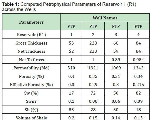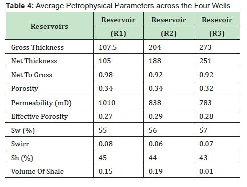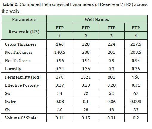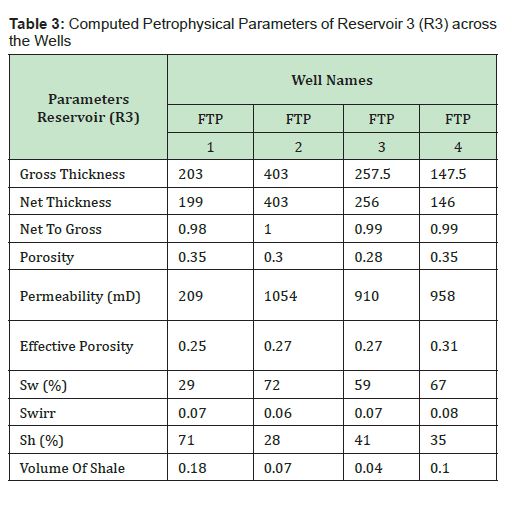 The reservoir properties of FTP 1, 2, 3 and 4 wells were calculated and presented in Table1 - Table 4. The computed average petrophysical parameters of interest for reservoir 1 (R1) include gross thickness of 107.5 m and net sand thickness 105 m, net-to-gross ratio of 0.98, volume of shale 0.15, porosity of 0.34, effective porosity of 0.27, water saturation 55%, hydrocarbon saturation 45% and permeability of 1010 mD. Reservoir 2 (R2) has an average gross thickness of 204m and net sand thickness 188 m, net-to-gross ratio of 0.92, volume of shale 0.19, porosity of 0.34, effective porosity of 0.29, water saturation 56%, hydrocarbon saturation 44% and permeability of 838mD. Reservoir 3 (R3) has an average gross thickness of 273 m and net sand thickness 251 m, net-to-gross ratio of 0.92, volume of shale 0.01, porosity of 0.32, effective porosity of 0.28, water saturation 57%, hydrocarbon saturation 43% and permeability of 783mD. Those value demonstrate that the reservoir exhibit good inter-pore connectivity, which is expected to have effective porosity and permeability within a good range. Table 4 displays the average computed petrophysical parameters for reservoir R1, R2 and R3, confirming the high permeability and effective porosity of reservoir R1, R2 and R3.