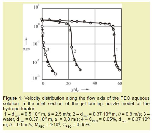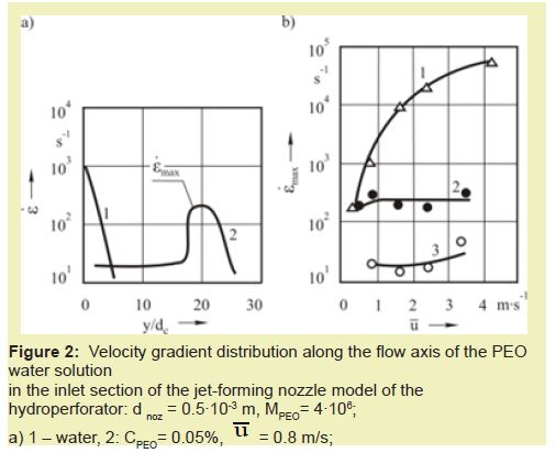 Hence, peculiarities of the free-converging flow of the polymeric solutions are associated with a high degree (~60 %) of reversible stretching of macromolecules caused by the hydrodynamic field and with an influence of the stretched macromolecules on the structure of the field. The experimental data obtained Tables 1 and 2 clearly indicate a strong deformational effect of the hydrodynamic field on the molecular coils of the polymer. This suggests that, during the flow of the polymer solution through the nozzle of the hydroperforator, polymer macromolecules are subjected to intense deformation caused by the longitudinal hydrodynamic field, as the velocity gradients generated in this process are sufficient to stretch the macromolecular chains.