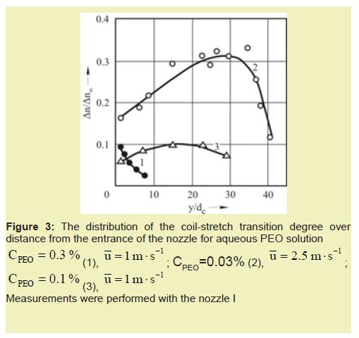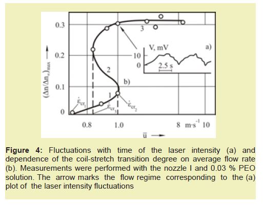 The flow becomes rather unstable after passing through the critical threshold, which can be seen from the plot of the laser beam intensity vs. time in Figure 4a the laser beam crossed the flow axis above the nozzele. The fluctuations are accompanied by the flow birefringence at the nozzle inlet. Hence, during the flow birefringence measurements, only maximal values at the given average flow rate of polymeric solution have been taken into consideration, as in the case of the velocity measurements. The obtained distribution of the deformational factor over the flow axis at the entrance of the nozzle capillary Figure 3 envisages the possibility of a high degree of coil-stretch transition under the free-converging flow conditions. The flow birefringence ratio attains the value of 0.33, which corresponds to ~60 % coil-stretch transition degree. Increasing the polymer concentration results in a decrease of the deformational factor (curve 3). Thus, for a 0.1 % PEO solution characterized by the , the