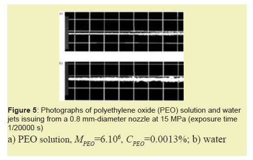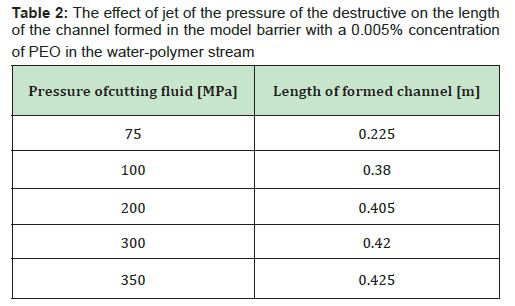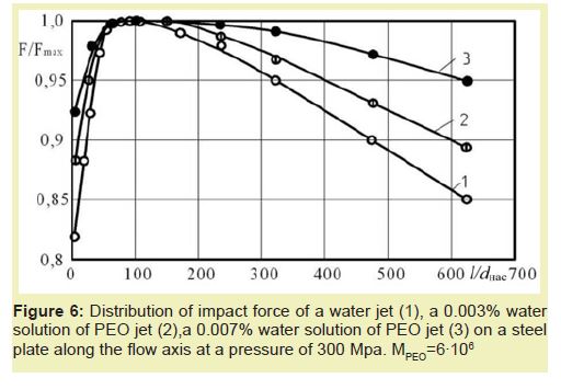 - 2. It has been established that the mechanism of the high destructive ability of the water-polymer jet is due to the dynamic pressure generated by the jet, which is "reinforced" by strongly extended macromolecular chains under the influence of extensional flow in the inlet area of the jet-forming nozzle.