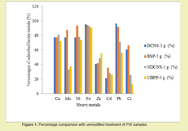 Considering the results shown in Figure 1, percentage reductions in heavy metal concentrations using unmodified DCNS were found to range from 21.4% to 98.9%, 25.9% to 92.6% with unmodified NDCNS, 35.7% to 99.5% using unmodified BSP and 13.0% to 91.0% with unmodified UBPP. The results revealed that treatment with 5g of unmodified adsorbents gave the best reductions in heavy metal concentrations compared with treatment using 1g of unmodified adsorbents, and this was because larger surface areas of adsorbent would improve adsorption process. The experimental results revealed that this study unmodified adsorbents have potential to reduce toxic heavy metals in produced water, as reductions in concentrations were observed in all heavy metals. The analysis of these unmodified adsorbents revealed that unmodified BSP gave the best treatment. This study had better results (Cu=81%, Ni=93.5%, Zn=55.3%, Pb=96.6%) than the results of Oboh and Aluyor,14 who used unmodified sour sop seeds (Cu=77.6%, Ni=68.5%, Zn=56.4%, Pb=40.6%) in their heavy metals’ removal.