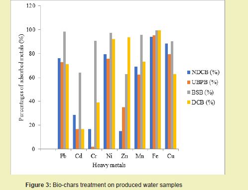 Unmodified non de-oiled and de-oiled cashew nut shells, banana stems powder and unripe banana peels powder have potentials to remove heavy metals substantially in produced water. This study showed that larger surface area of adsorbents would improve adsorption process. Unmodified banana stems powder performed best among others in the removal of heavy metals. Chemically modified non-de-oiled and de-oiled cashew nut shells, banana stems powder and unripe banana peels powder have better potentials to remove heavy metals in produced water than the unmodified, under a batch process. The study showed that the time used for chemical modification could affect modified bio materials; with optimum treatment of metal extraction from produced water obtained at two hours of chemical modification, after which desorption set in. Chemical modification on bio-materials gave longer shelf life to modified bio-materials compared to unmodified bio-materials. Modified bio-materials would biodegrade slower than unmodified bio-materials due to chemical modification. Modified de-oiled cashew nut shells performed best among others. Non de-oiled and de-oiled cashew nut shells bio-char, banana stems bio-char and unripe banana peels bio-char have the highest adsorption efficiency for the removal of heavy metals in produced water both in batch process. Banana stems bio-char performed best among all other bio-chars. The adsorption isotherms used to analyse the sorption process of each heavy metal in the produced water showed that Langmuir isotherm explained nickel, lead, cadmium, copper, iron, manganese and zinc; while chromium performed better under Freundlich isotherm description. Thus, banana stem bio-char has the most effective adsorption strength to treat produced water for optimal extraction of heavy metals before it is disposed into the marine environment or re-used for water flooding and other benefits.