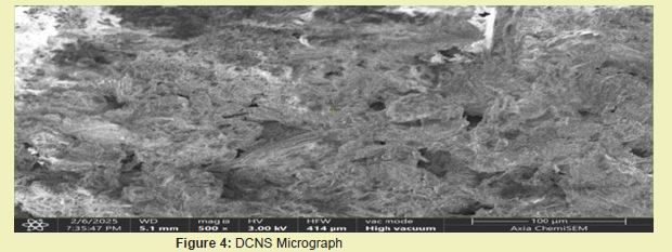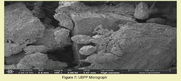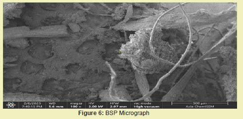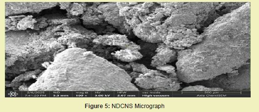 Both DCNS Figure 4 and NDCNS Figure 5 had rough and porous surfaces with compact structure from their SEM images, except that DCNS had smoother surface texture and better surface area. And this was the reason for DCNS better adsorption efficiency than NDCNS. The BSP Figure 6 revealed a more compact, less porous structure and smooth surface compared to BSB from its SEM image, reason for its lesser efficiency. The UBPP Figure 7 from its SEM image showed a mixture of smooth and rough surfaces which were more compact, with higher moisture content; and hence, reason for its low adsorption capacity. Results for BSB treatment gave the best results among the bio-chars used because it showed a highly porous structure with a rough surface, indicating a very high surface area from its SEM image Figure 8.