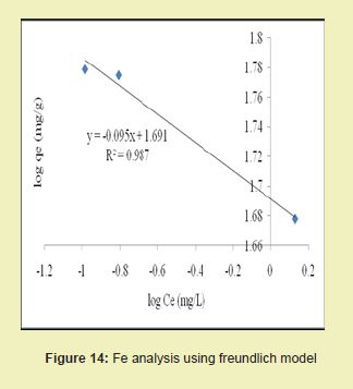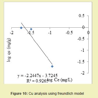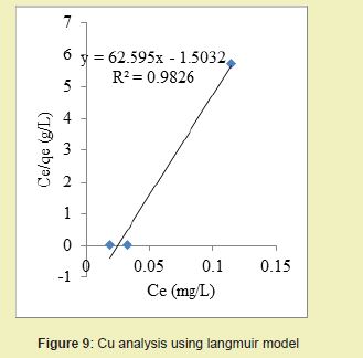 Considering the linear graph plots Figures 9 and 10, it was shown that the correlation coefficients (R2) for Cu ion were 0.982 and 0.926 for Langmuir and Freundlich models respectively. It suggested that adsorption process for Cu ion obeyed Langmuir model. This finding suggested that Langmuir model was more suitable for equilibrium studies of Cu ion than Freundlich model.