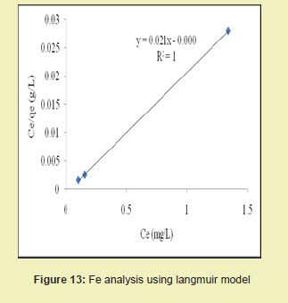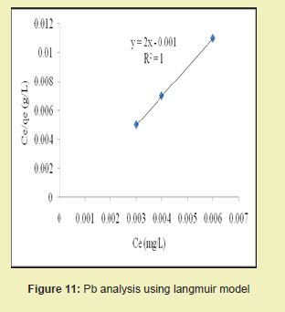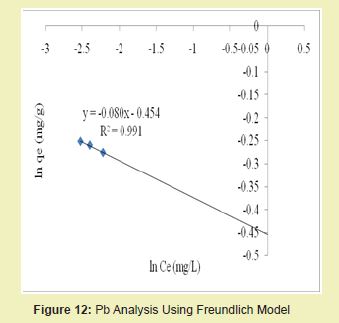 The graphical representations of results considering Figures 11 and 12 above showed that the correlation coefficients (R2) for Pb ion were 1 and 0.991, respectively. It suggested that adsorption process for Pb ion obeyed Langmuir model. This finding suggested that Langmuir model was more suitable for equilibrium studies of Pb ion than Freundlich model.