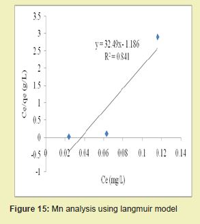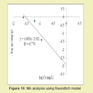 Figures 13 and 14 showed graphical representations of the isotherm results for Fe. Considering the linear graph plots, showed that the correlation coefficients (R2) for Fe ion were 1 and 0.987, respectively. It suggested that adsorption process for Fe ion obeyed Langmuir model. This finding suggested that Langmuir model was more suitable for equilibrium studies of Fe ion than Freundlich model. The correlation coefficients (R2) for Mn ion as seen in Figures 15 and 16 were 0.841 and 0.770, respectively. It suggested that adsorption process for Mn ion obeyed Langmuir model. This finding suggested that the Langmuir model was more suitable for equilibrium studies of Mn ion than the Freundlich model. Furthermore, the results indicated that Mn ions exhibit monolayer coverage of adsorbate on bio-adsorbent surface.