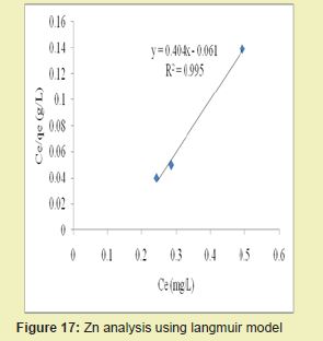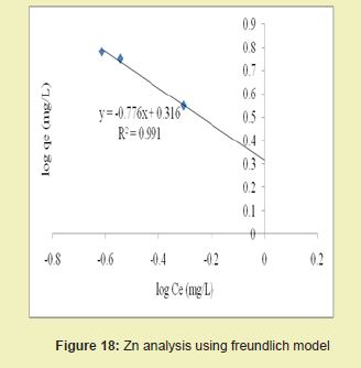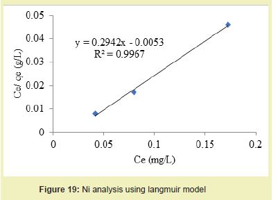 Considering the linear graph plots for Zn in Figures 17 and 18, showed that correlation coefficients (R2) for Zn ion were 0.995 and 0.991, respectively. It suggested that adsorption process for Zn ion obeys Langmuir model. This finding suggested that Langmuir model was more suitable for equilibrium studies of Zn ion than the Freundlich model. Figures 19 and 20 showed the correlation coefficients (R2) for Ni ion were 0.982 and 0.926, respectively. It suggested that adsorption process for Ni ion obeyed Langmuir model. This finding suggested that Langmuir model was more suitable for equilibrium studies of Ni ion than Freundlich model.