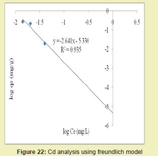 Figures 21 and 22 showed the graphical representations of the results from the analysis of Cd by using both the Langmuir and Freundlich models for modified DCNS. The linear graph plots showed that correlation coefficients (R2) for Cd ion were 0.959 and 0.935, respectively. It suggested that adsorption process for Cd ion obeyed Langmuir model. This finding suggested that Langmuir model was more suitable for equilibrium studies of Cd than Freundlich model.
