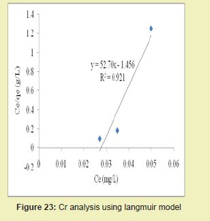 Figures 23 and 24 showed graphical representations of the results of the analysis of Cr using both the Langmuir and Freundlich models for modified DCNS. Considering the linear graph plots, showed that correlation coefficients (R2) for Cr ion were 0.921 and 0.933, respectively. It suggested that adsorption process for Cr ion obeyed Freundlich model. This finding suggested that Freundlich model was more suitable for equilibrium studies of Cr ion than Langmuir model.