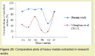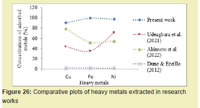 The BSB of 5g extracted 98.31% Pb from the PW, which was better than the method of Udeagbara17 which extracted 23.48% Pb Figure 25. BSB treatment extracted 90.52% Cu from PW, unlike Akinsete16 method which extracted 88% Cu, Dune and Ezeillo18 method that removed 2.15% Cu and Udeagbara17 method which extracted 43.65% Cu Figure 26. BSB treatment extracted 99.43% Fe from PW compared to Akinsete method which extracted 52% Fe. The BSB treatment method extracted 97.45% Ni from PW while Udeagbara17 extracted 71.42% and Akinsete16 extracted 55%. These stated observations indicated that BSB adsorbent has more adsorption efficiency in heavy metals extraction from PW than any other existing adsorbents.